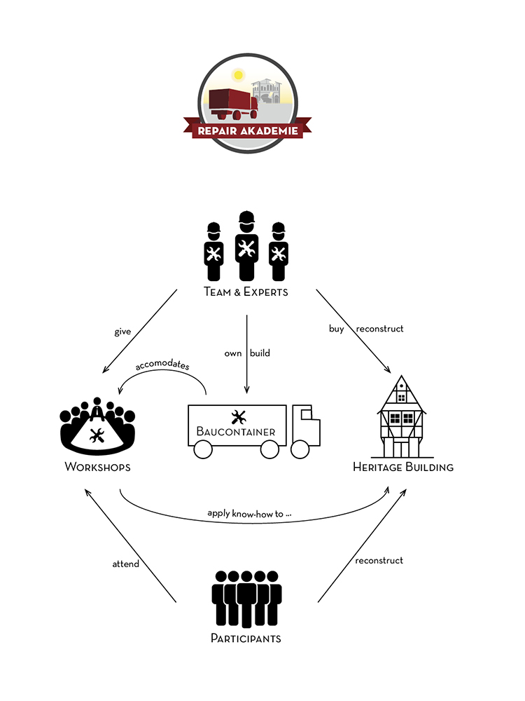 In Halle it's all about individual renovation of historical buildings. Interested professionals and laymans are instructed in all aspects of reconstruction by specialized craftsmen, provided by the "Repair Academy". We suggest to offer that service free of charge. This can be enabled through the conceptual idea of an application of trainees' new abilities directly to the renovation process:
